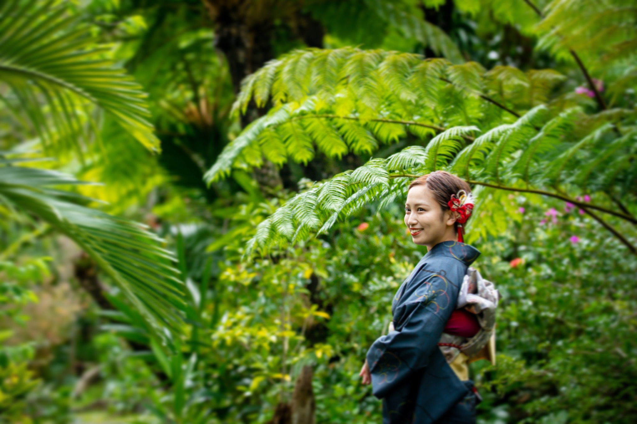 大島紬に飾り結びで華やかにコーディネートをする若い女性も多くいます。